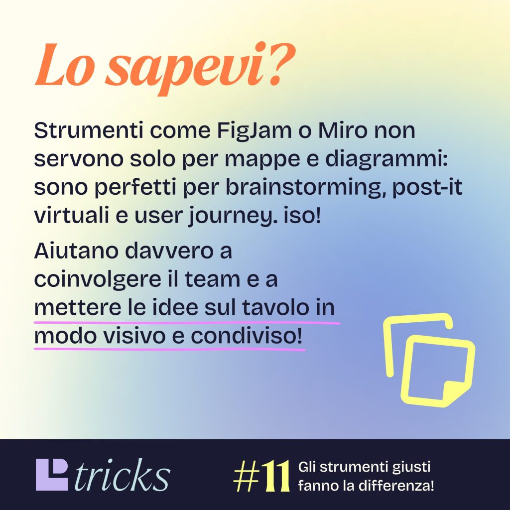 Strumenti come FigJam o Miro non servono solo per mappe e diagrammi: sono perfetti per brainstorming, post-it virtuali e user journey. Aiutano davvero a coinvolgere il team e a mettere le idee sul tavolo in modo visivo e condiviso!