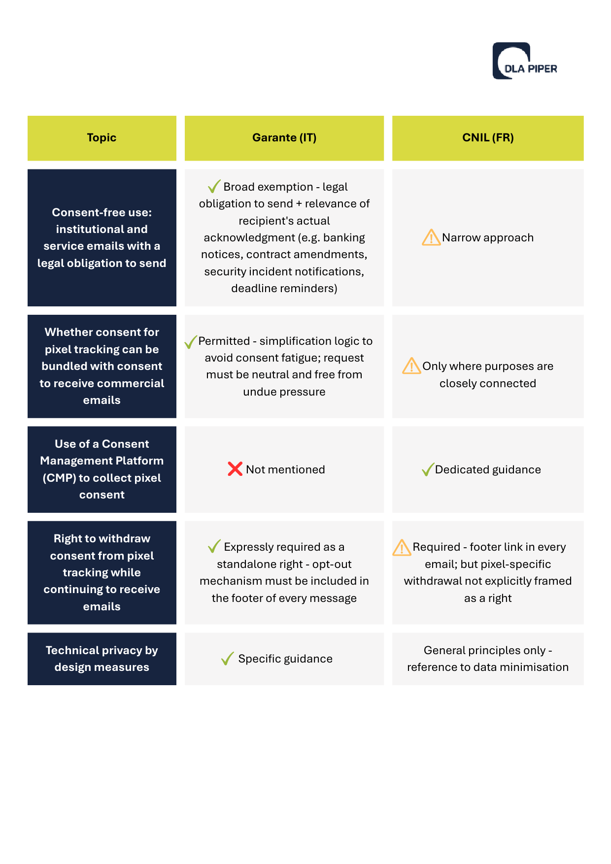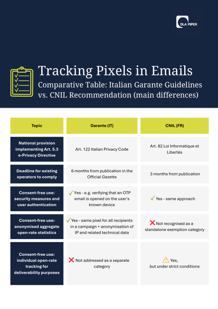 L’adozione quasi contestuale di questi due provvedimenti da parte delle autorità italiana e francese riflette una convergenza di fondo nella qualificazione giuridica dei tracking pixel come strumenti di accesso al terminale soggetti alla disciplina della direttiva e-Privacy, e nella conseguente applicazione del regime di consenso previsto dalle rispettive norme di recepimento nazionale. Le divergenze riguardano essenzialmente l’ampiezza delle esenzioni – più estesa nell’impostazione italiana, più restrittiva in quella francese – e il grado di proceduralizzazione delle modalità di raccolta del consenso, su cui la CNIL si mostra più analitica.